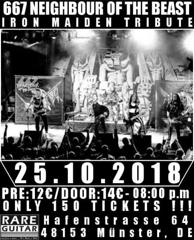 „… woe to you, oh earth and sea,…“ – kaum eine Band in der Geschichte des Britischen Heavy Metals hat diese Musikrichtung so beeinflusst wie Iron Maiden. Die Band, die schon vor Jahrzehnten zu einer lebenden Legende geworden ist und immer noch tapfer um die Welt tourt. Mit dem an einen ihrer größten Hits angelehnten Bandnamen „667 – The Neighbour of the Beast“ haben sich fünf Musiker zu einer Gemeinschaft zusammengefunden, um Iron Maiden Tribut zu zollen. Dabei geht es weniger darum, die Klassiker einfach nur Ton-für-Ton nachzuspielen, sondern vielmehr darum den Sound, die Bühnenpräsenz und die Stimmung so authentisch wie möglich auf der Bühne zu präsentieren. Angefangen vom original 80er Jahre Iron Maiden Outfit, der Verstärkertechnik, den Instrumenten, dem Bühnenbild bis hin zum obligatorischen Auftritt des Iron Maiden Maskottchens Eddie lassen die 5 Musiker bei jedem Auftritt das Maiden-Feeling auf das Publikum überspringen. Gegründet wurde 667 bereits 1998 und seit mehreren Jahren unverändert treten Kasten (Bass), Felix (Drums), Mächel (Gitarre), Günther (Gitarre) und der stimmgewaltige Daniel deutschlandweit und international auf, spielten unter Anderem als Support von Doro und AXXIS, und spielten auf Festivals mit Bands wie Sodom, J.B.O., den Apokalyptischen Reitern, Manfred Mann´s Earthband, Slade, The Sweet und vielen anderen. Seit 2008 ist 667 auch fester Bestandteil der in ganz Europa stattfindenden Iron Maiden World Conventions. Egal ob in einem kleinen Klub oder auf einem großen Festival, 667 gibt in jeder Location ALLES und fasziniert immer wieder mit Einsatz und ungebändigter Spiellaune! Neben der ohnehin schon unterhaltsamen Show bietet 667 wann immer sich die Möglichkeit ergibt ihrem Publikum diverse „Specials“ und Gastauftritte bekannter Musikerkollegen. So standen unter anderem schon Paul DiAnno, Dennis Stratton (beide Iron Maiden), Tobias Sammet (Avantasia), Luca Princiotta (Doro) und Jens Ludwig von EDGUY mit 667 auf der Bühne. Zu seinen Auftritten mit 667 sagt Jens: „Ich kenne und schätze die Band schon seit Jahren, aber erst im Mai 2010 ergab sich für mich die Möglichkeit mal mit ihnen auf der Bühne zu stehen als ich Gitarrist Günni bei einem Gig vertreten und kurz darauf bei anderen Shows ein paar Songs als dritter Gitarrist mitgespielt habe. Das hat sowohl mir als auch 667 soviel Spaß gemacht, dass wir beschlossen haben dies -wann immer mein Terminkalender es zulässt- zu wiederholen. Auch mal für eine komplette Show vom Intro bis zu den Zugaben! Die Jungs sind einfach cool drauf und stecken einen mit dem Spaß den sie an der Sache haben sofort an!“ Dem ist wohl nicht mehr viel hinzuzufügen. 667 – The Neighbour of the Beast verbindet in Summe etwa 1 Jahrhundert Live- und fast einmal um den Erdball „on-the-Road“ – Erfahrung zu einer authentischen Iron Maiden Tribute Show.